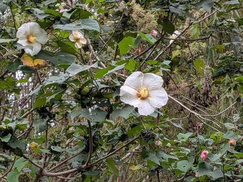 花開得很大、很亮,在綠葉之間特別顯眼。我忍不住查了一下資料,才知道原來它叫做 台灣山芙蓉。外觀很像木芙蓉,但不同的是——它的花不會變色。我目前看到的只有白色和淡粉色的花朵,每一朵都像安靜地停在樹上的小雲朵。