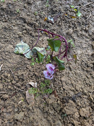 四天前才剛種下去的紫芋地瓜,今天竟然在田畦裡開花了。